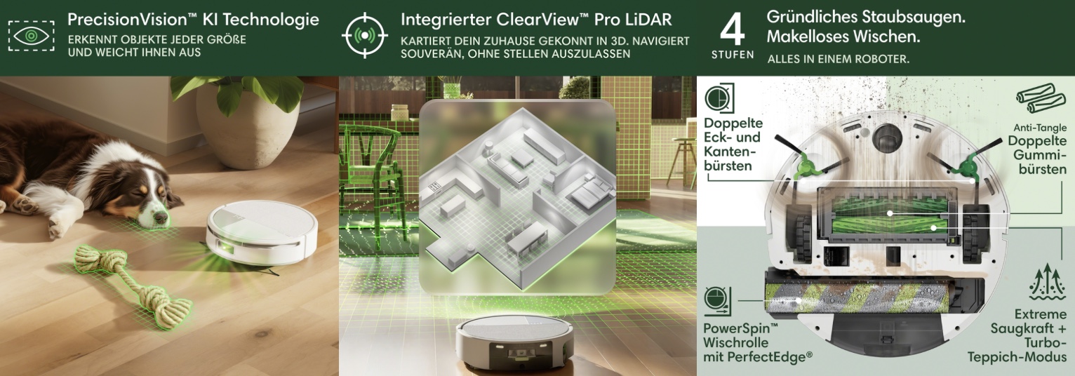 Der Roomba® Max 705 Combo passt perfekt in moderne Wohnwelten und nimmt seinen Nutzer:innen die Hausarbeit vollständig ab. Ausgestattet mit einer selbstreinigenden Wischrolle, einer präzisen Kantenreinigung und doppelten Anti-Tangle-Gummibürsten beseitigt er Staub, Schmutz und Tierhaare zuverlässig. Das smarte AutoWash™ Dock sorgt zusätzlich für maximalen Komfort: Es entleert den Roboter automatisch, wäscht und trocknet den Wischmopp hygienisch mit Heizfunktion, reinigt sich selbst und füllt Wasser nach – für wochenlange Sauberkeit ganz ohne Handgriff. Dank 175-fach stärkerer Saugleistung*, intelligenter 3D-Kartierung mit ClearView™ Pro LiDAR sowie PrecisionVision™ AI erkennt der Roboter Hindernisse wie Kabel, Spielzeug oder Haustierunfälle und navigiert mühelos darum herum. Ein automatischer Teppichschutz sorgt außerdem dafür, dass Böden trocken bleiben. Gesteuert wird der smarte Helfer bequem über die Roomba® Home App oder per Sprachbefehl. Voraussetzung ist lediglich eine WLAN-Verbindung.